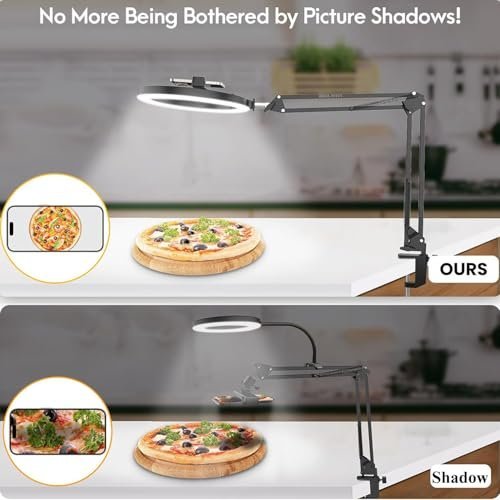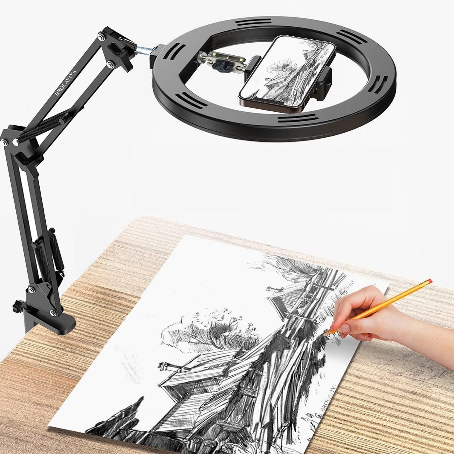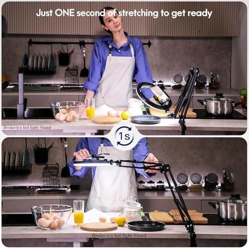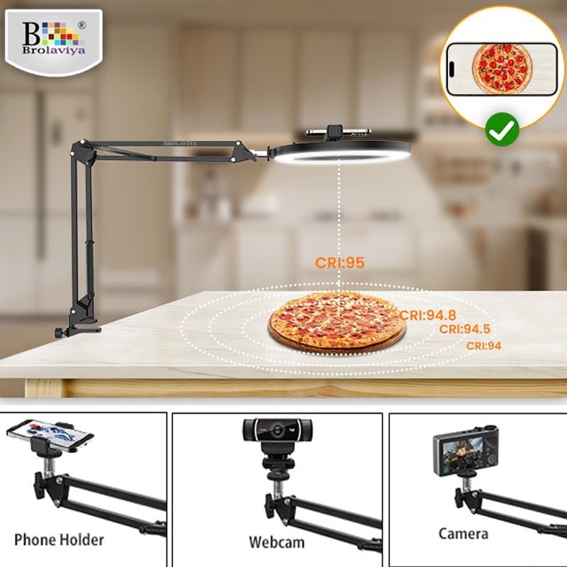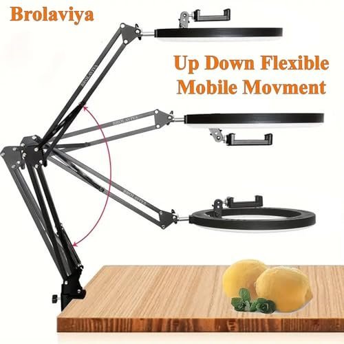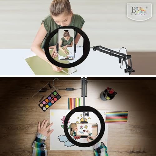 Brolaviya No Shadow Overhead Video Mobile Stand With 10Inch Selfie Ring Light, Metal Arm,1/4″ Adaptor For Camera, Gopro And Mobile Bracket For Desktop, Bedroom, Office