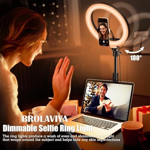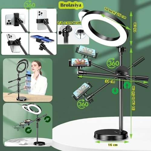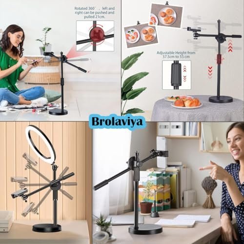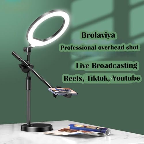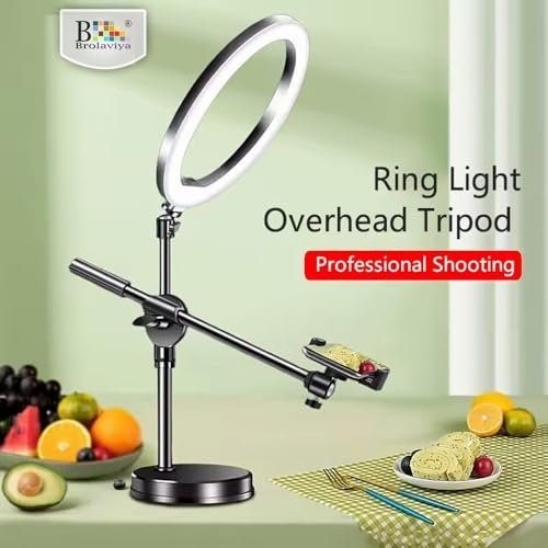 Brolaviya Overhead Video Floor Stand With 10-Inch Ring Light, Metal Arm,1/4″ Ball Head For Camera,Webcam,Gopro, With Mobile Bracket For Youtube, Desktop, Bedroom, Office.