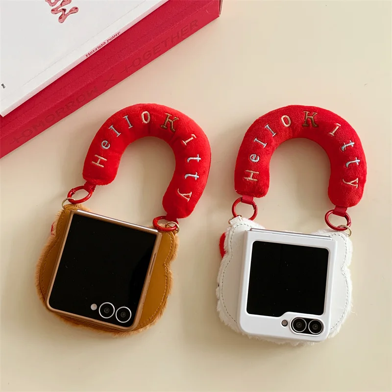 Kawaii Cartoon Plush Hellokitty Phone Case For Samsung Galaxy Z Flip 7 6 5 4 3 ZFlip6 ZFlip5 Cover with Hand Strap Cute Cases Ca