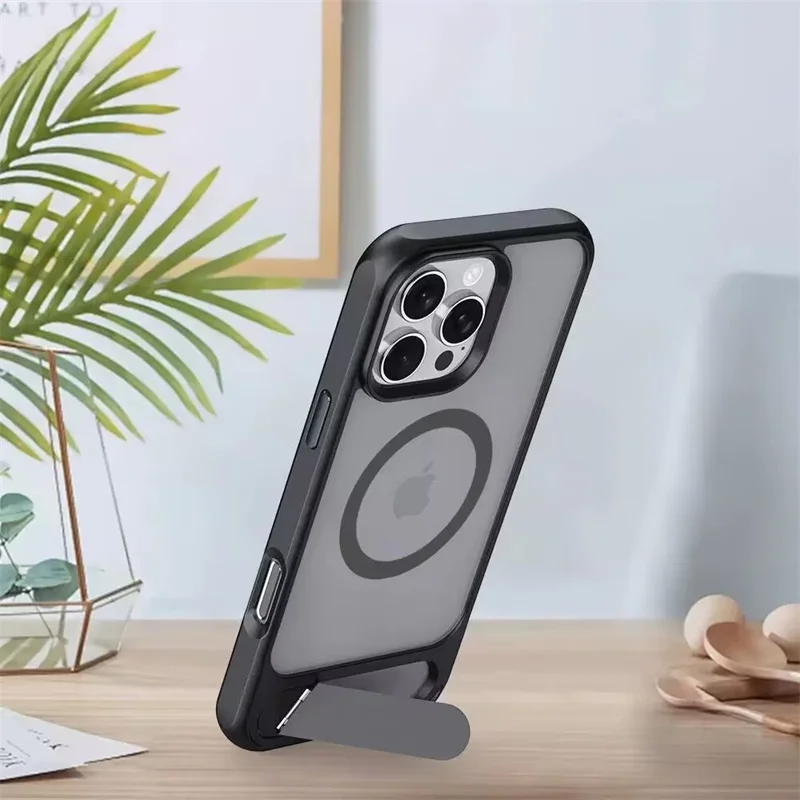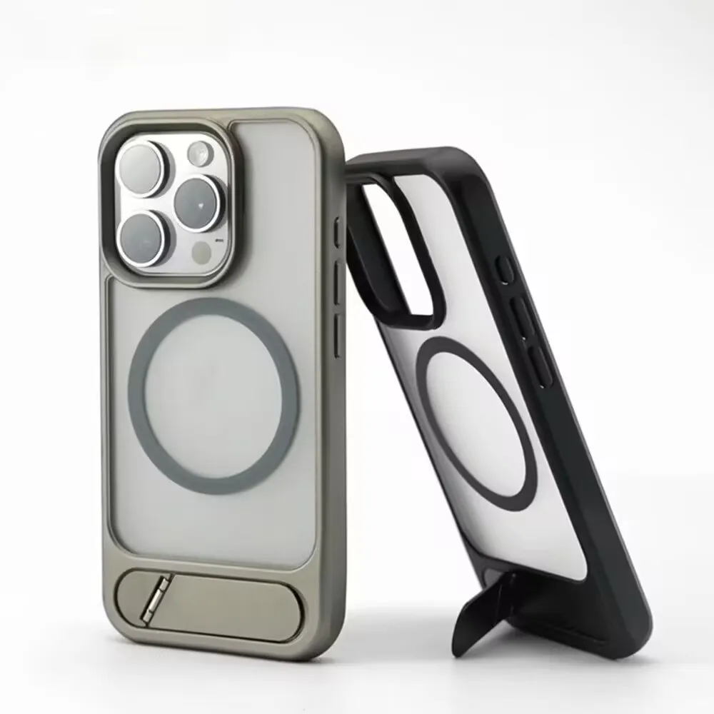 Luxury Metal Stand Clear Magnetic Phone Case For iPhone 16E 11 12 13 14 15 16 Pro Max Plus Bracket Shockproof Protector Cover