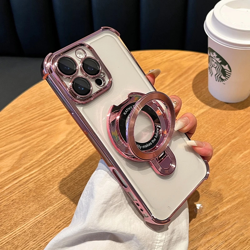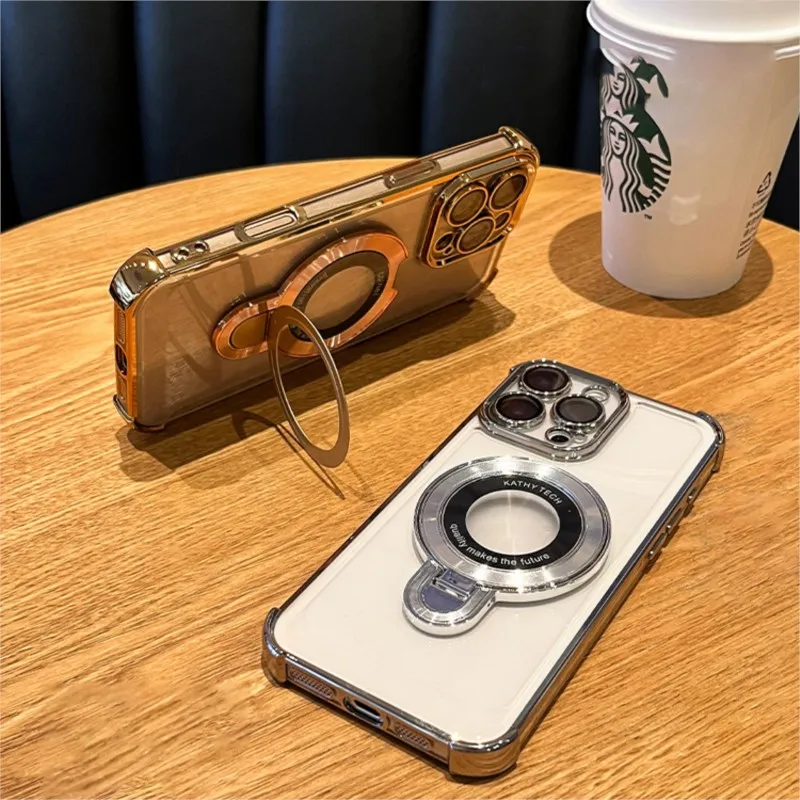 Luxury Plating Magsafe Wireless Charge Case For iPhone 16 15 14 13 12 11 Pro Max Plus Clear Acrylic Magnetic Stand Holder Cover