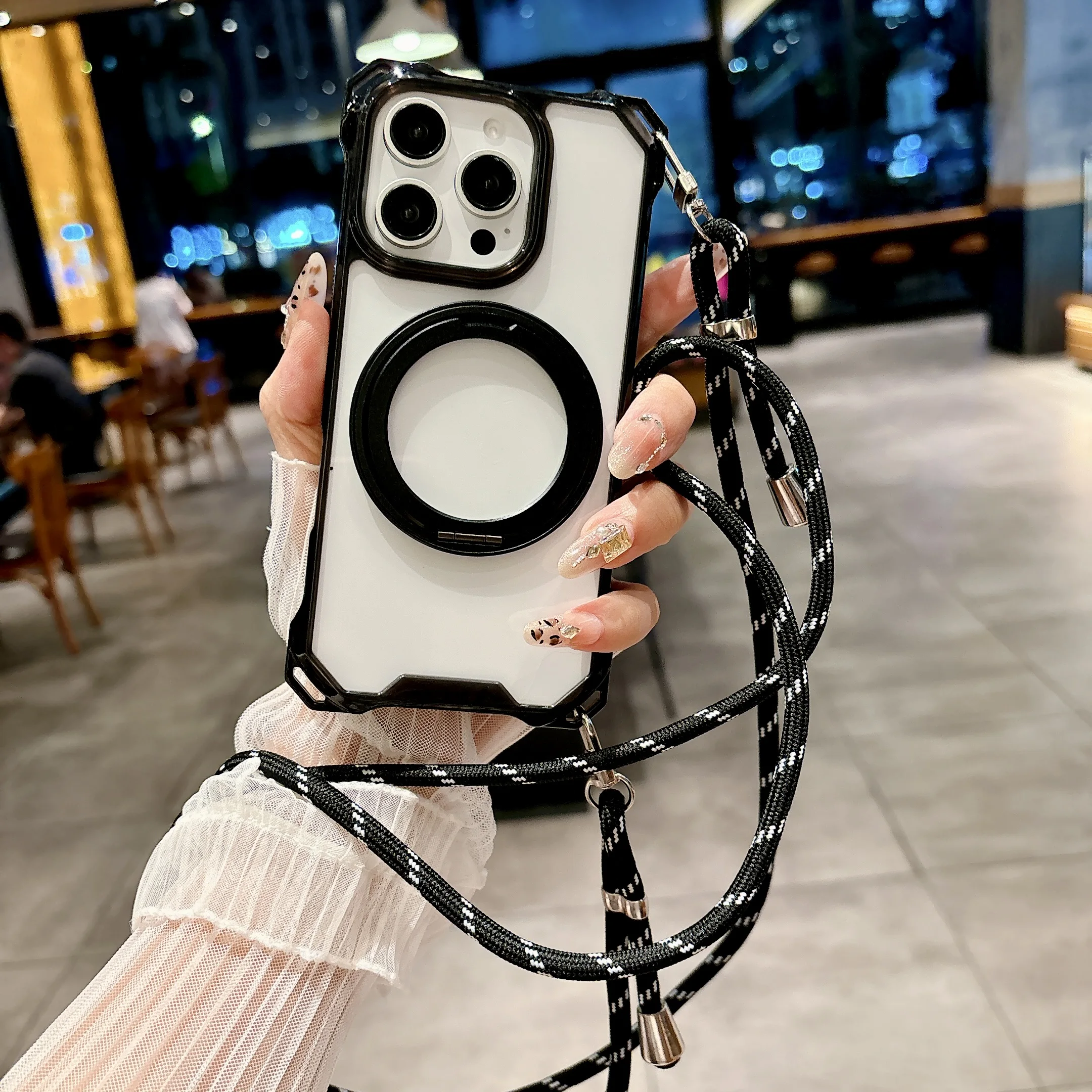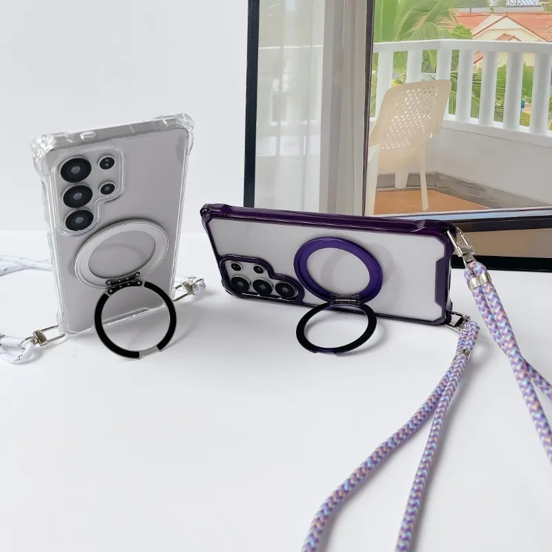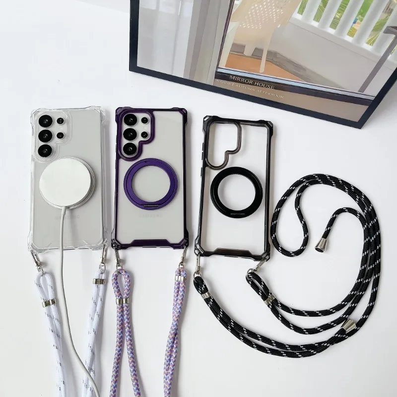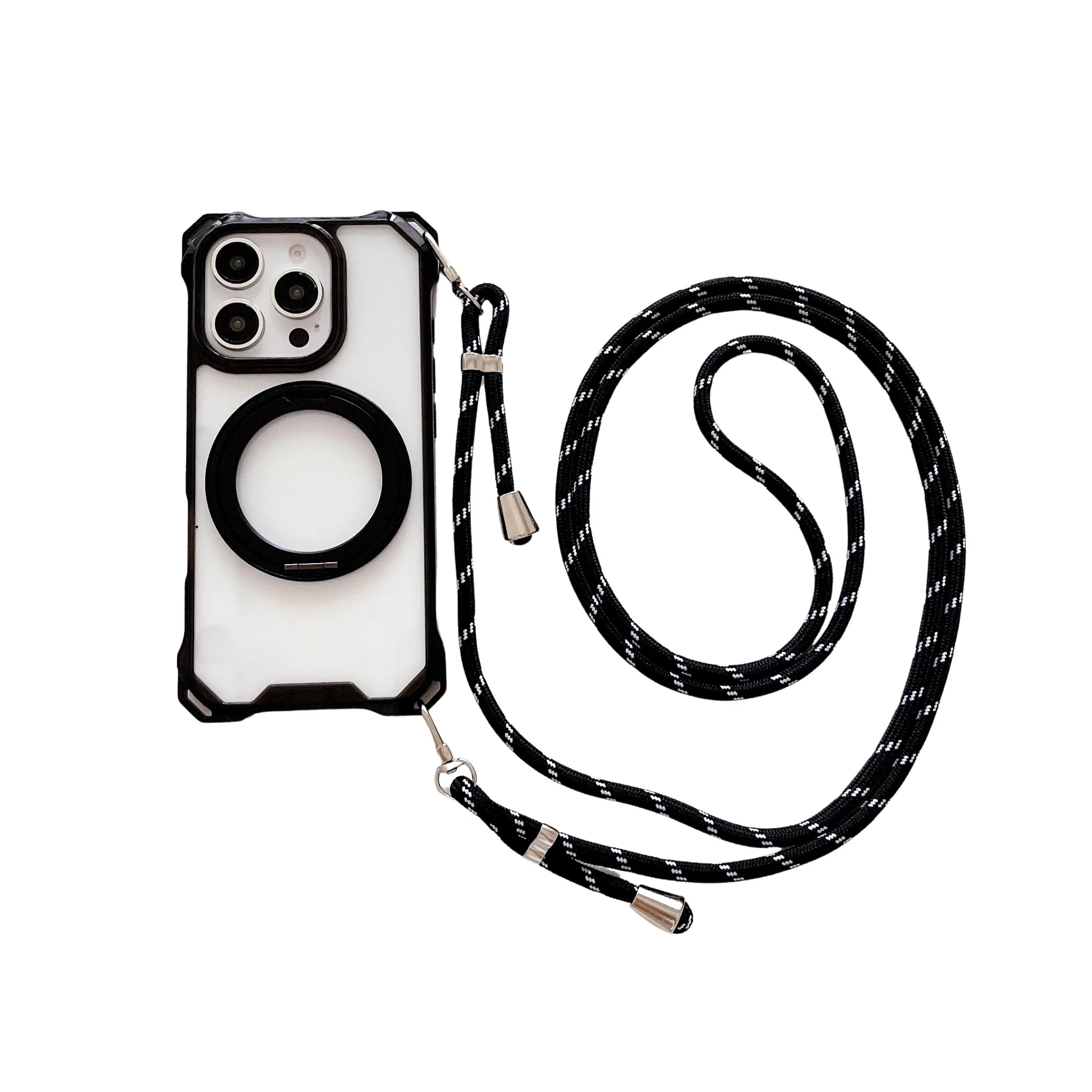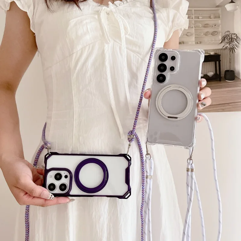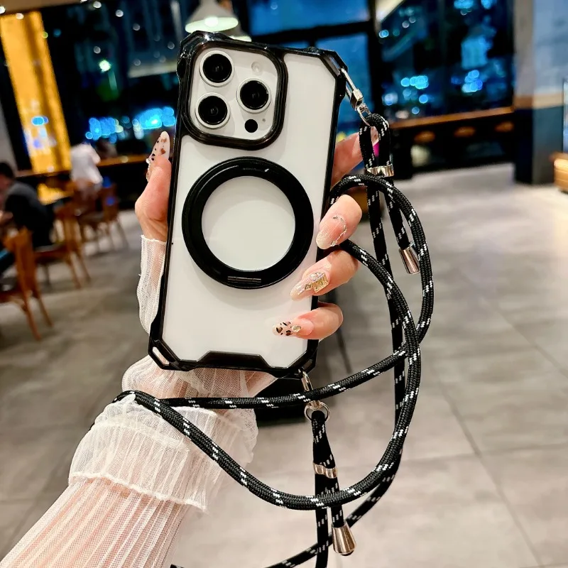 Magnetic Stand Four Corners Strap Case For iPhone 16 Pro Max 15 13 11 12 14 Plus 16E for Magsafe Ring Crossbody Lanyard Cover