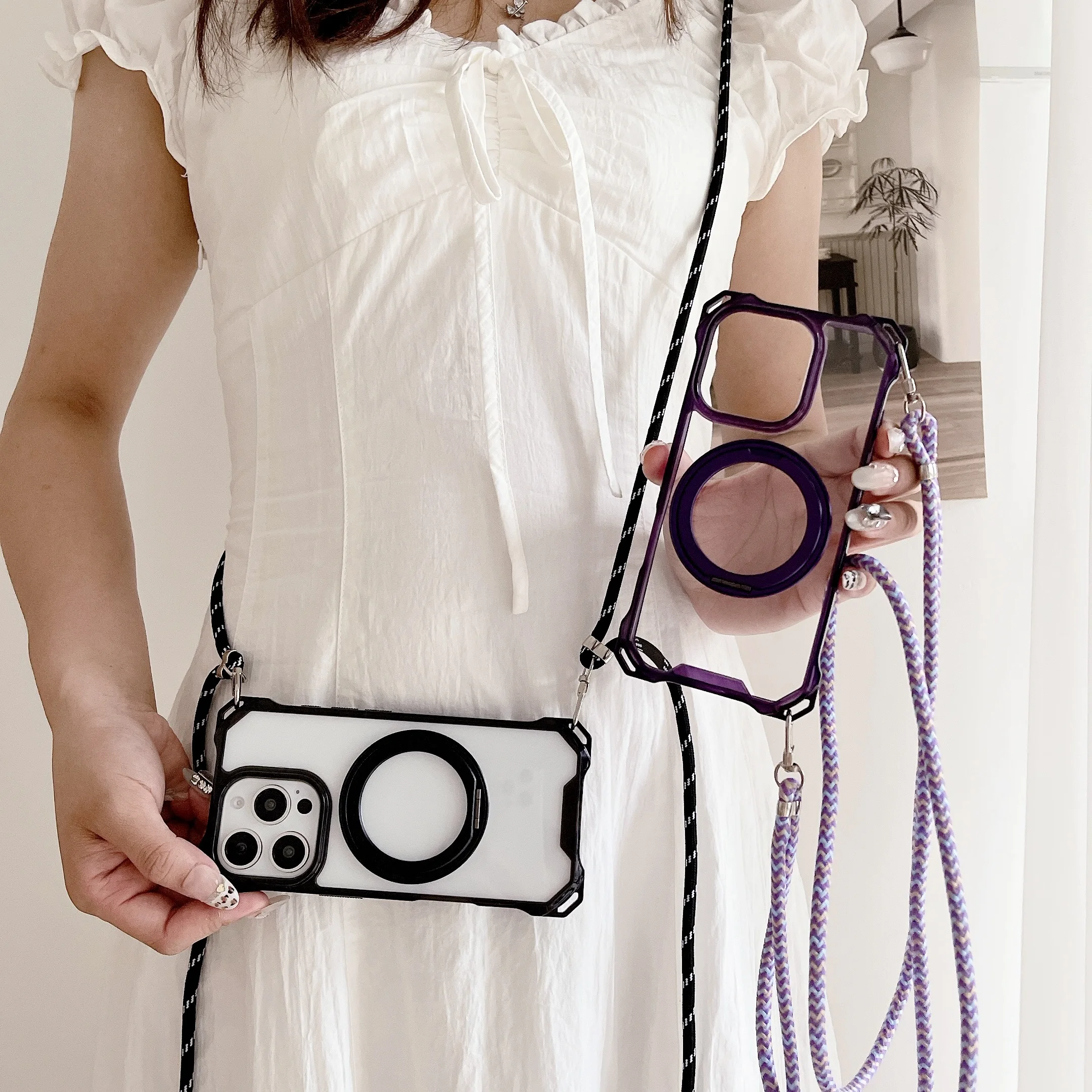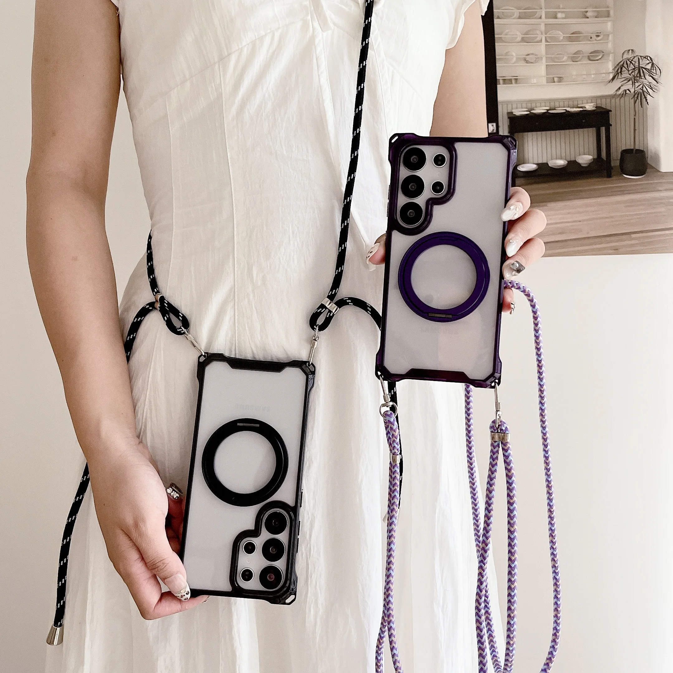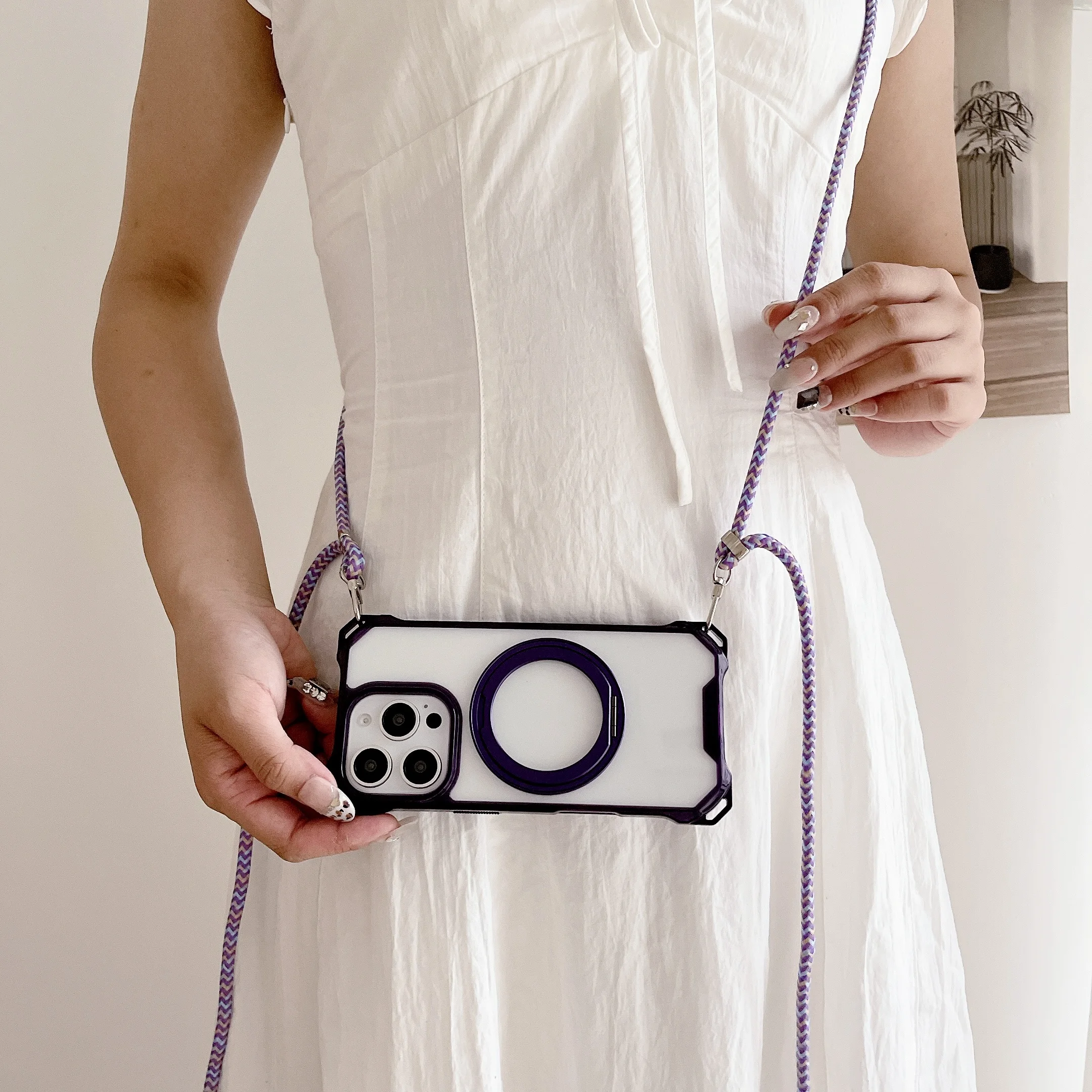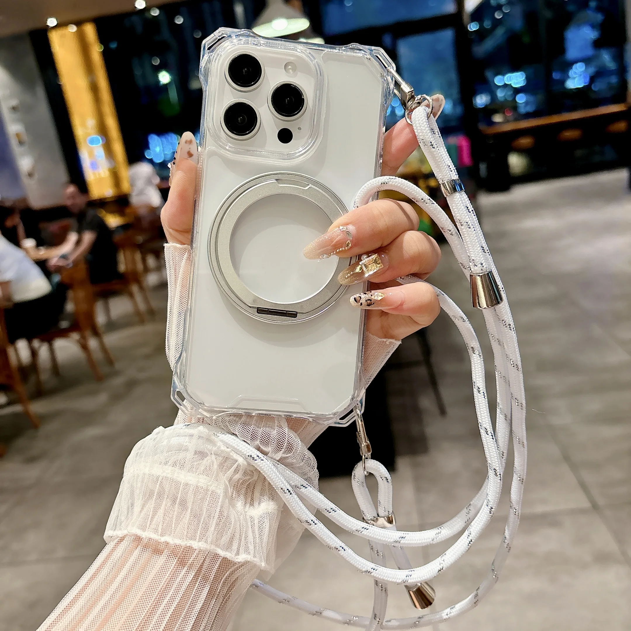 Magnetic Stand Four Corners Strap Case For iPhone 16 Pro Max 15 13 11 12 14 Plus 16E for Magsafe Ring Crossbody Lanyard Cover