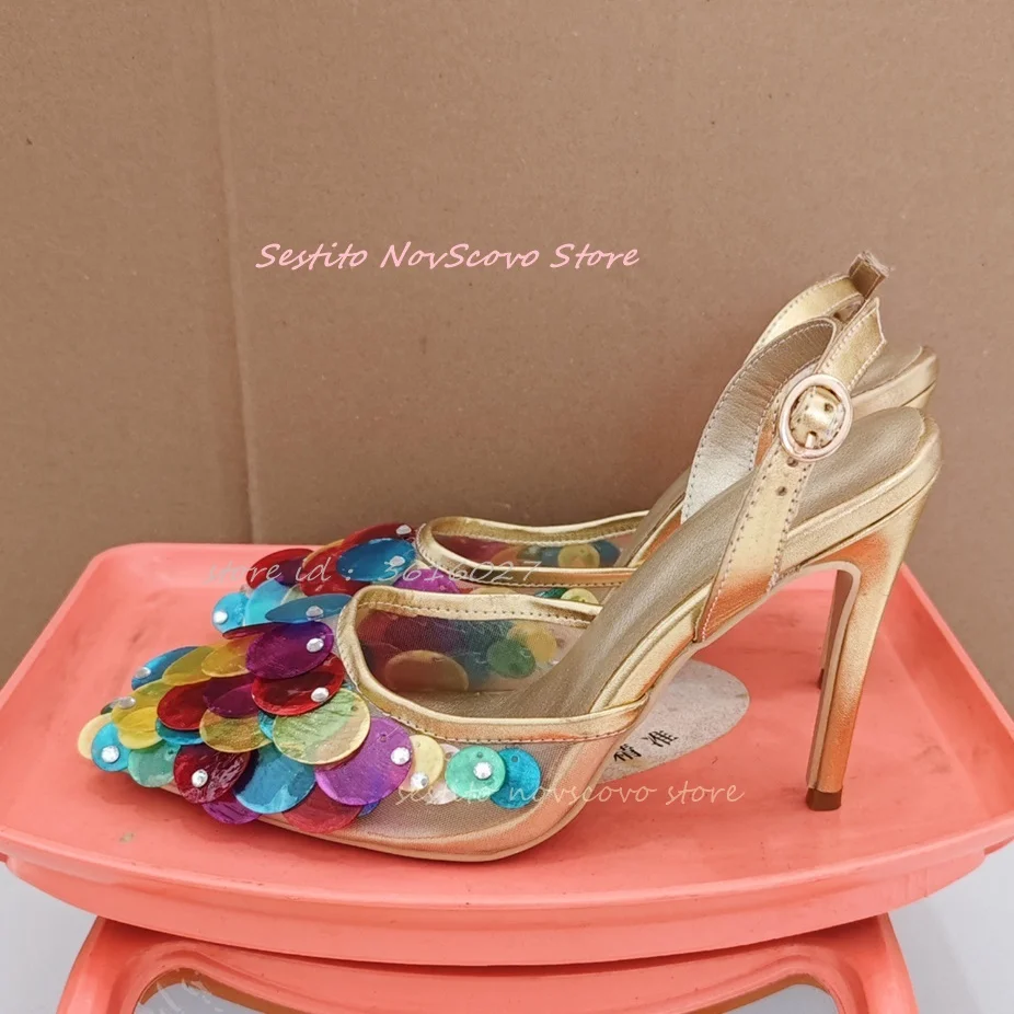 Pointed Toe Colorful Sequins Sandals Back Strap Buckle Sexy Women Summer Stiletto High Heels Pumps Classic Dress Party Shoes