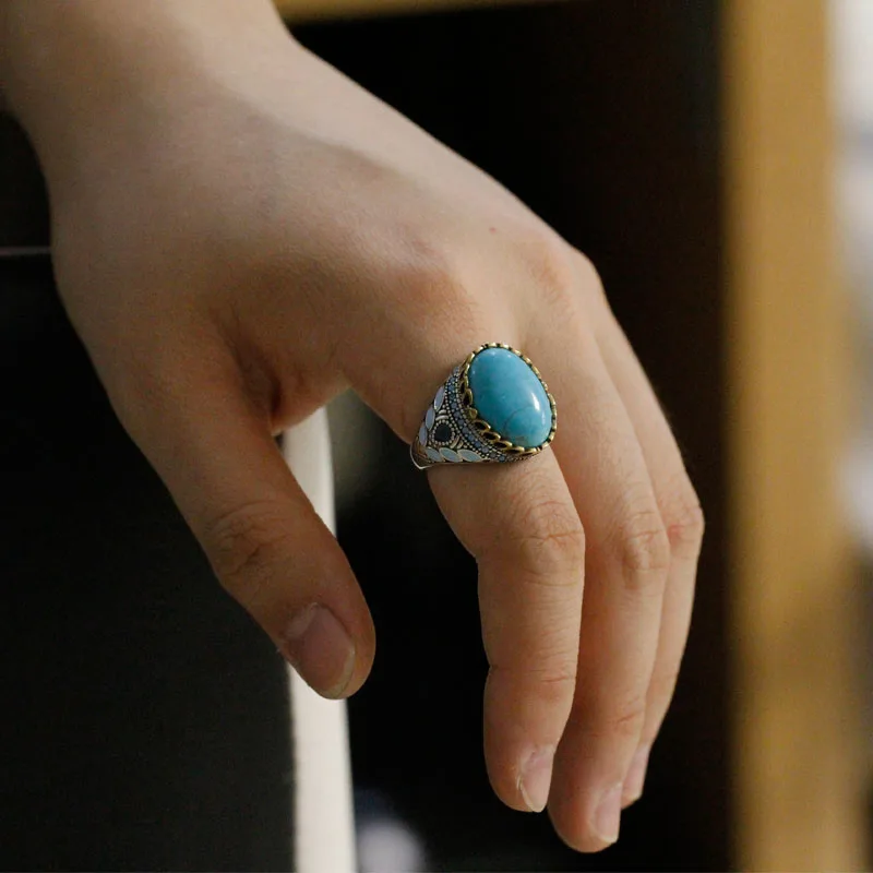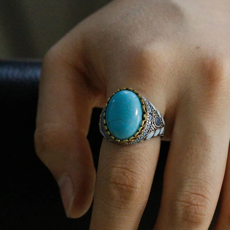 Vintage Natural Turquoise Türkiye Ring Fashion 925 Sterling Silver Oval Sky Blue Gem Anniversary Jewelry Party Gift