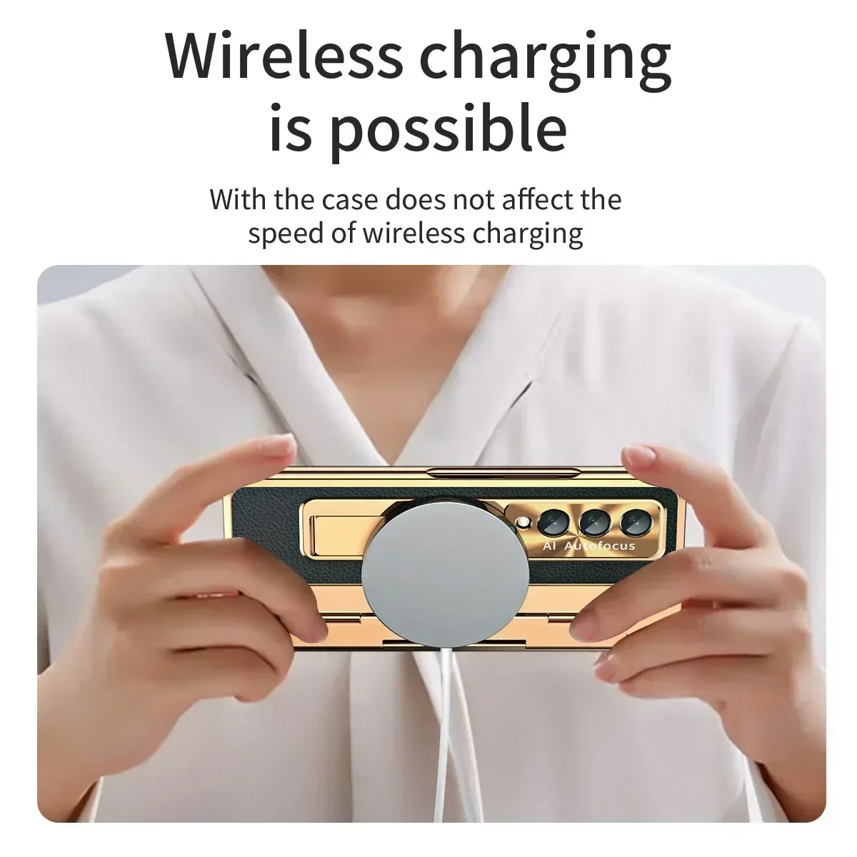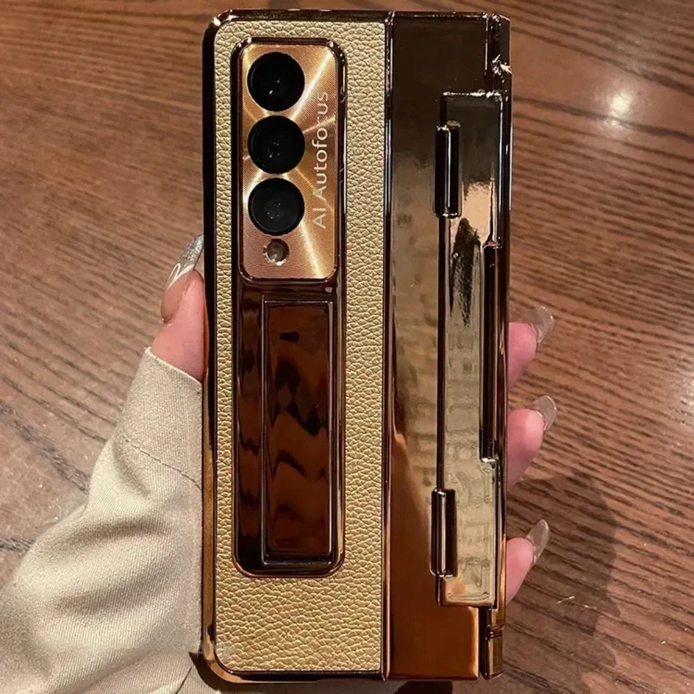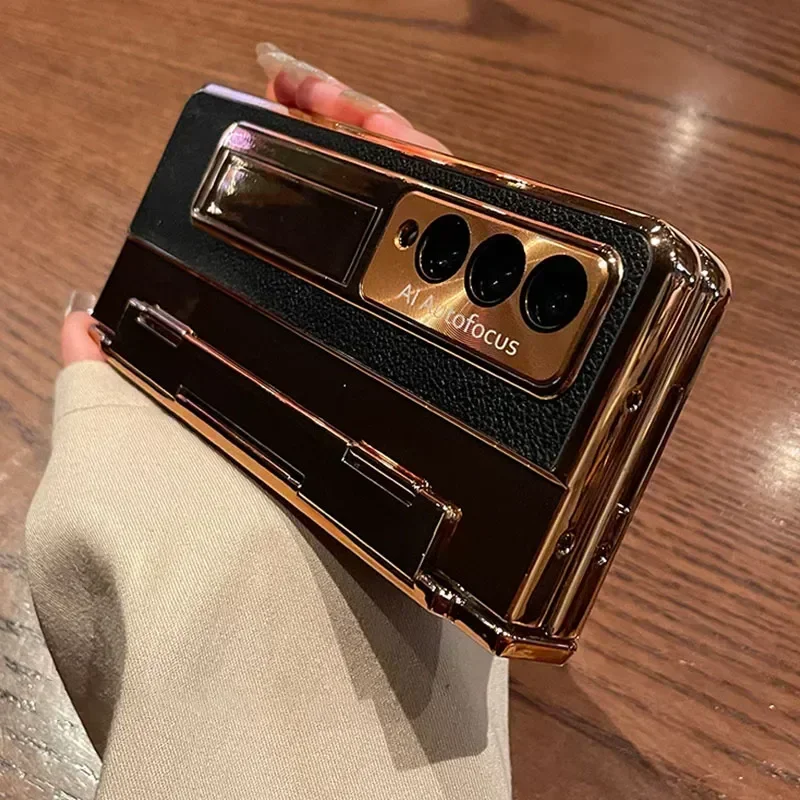 With Screen Protector Luxury Leather Case for Samsung Galaxy Z Fold 6 5 4 3 5G One-Piece Plating Stand Shockproof Cover Gold